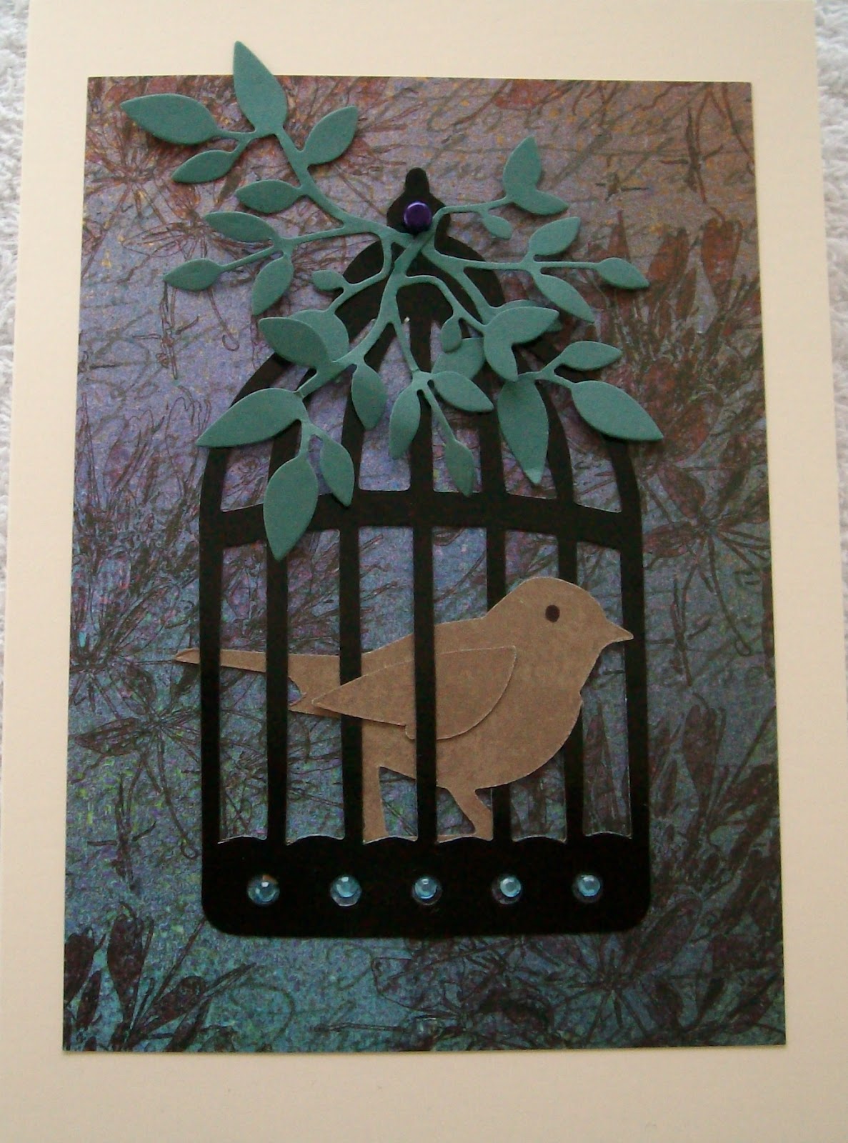 Had a few Thank you cards to make and one of the teachers is retiring so made a job lot of these cards using Chocolate Baroque papers, Tim Holtz Caged Bird die, Marrianne Bird on Branch die (minus the bird!) and a few brads and gems.